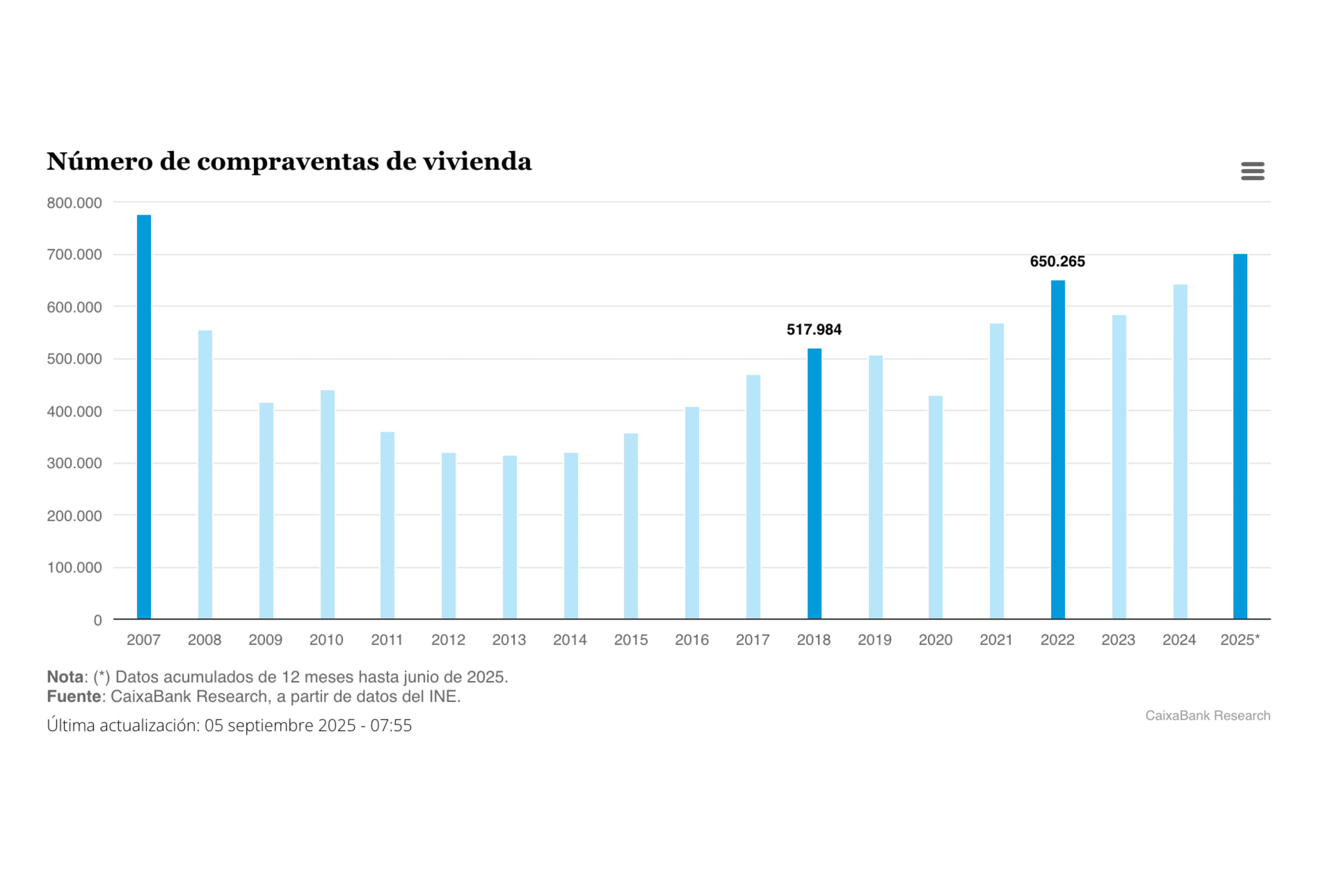 De acuerdo con el Informe Sectorial de CaixaBank Research (octubre 2025), en los doce meses hasta junio se registraron más de 700.000 compraventas, un 19,7 % más que en el mismo periodo del año anterior. La demanda continúa impulsada tanto por compradores nacionales como por el creciente peso del inversor extranjero, que ya representa cerca del 15 % del total de operaciones.