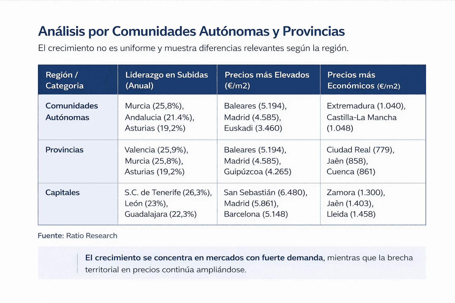 En enero de 2026, el precio de la vivienda usada en España alcanzó los 2.650 €/m², con una subida interanual del 18,4% que supone el mayor incremento registrado en la historia de la serie de idealista. La vivienda nueva no se queda atrás: cerró 2025 con incrementos cercanos al 9%, situándose en una media nacional de 3.300 €/m², con previsión de alcanzar los 3.432 €/m² en el primer semestre de este año, según datos de Capital Radio y Culmia.